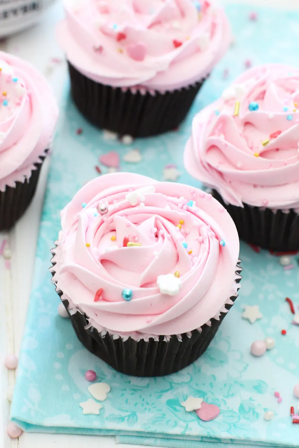 La base de estos cupcakes es un bizcocho super esponjoso de chocolate y la cobertura es un frosting listo para el uso de la marca Dekora.