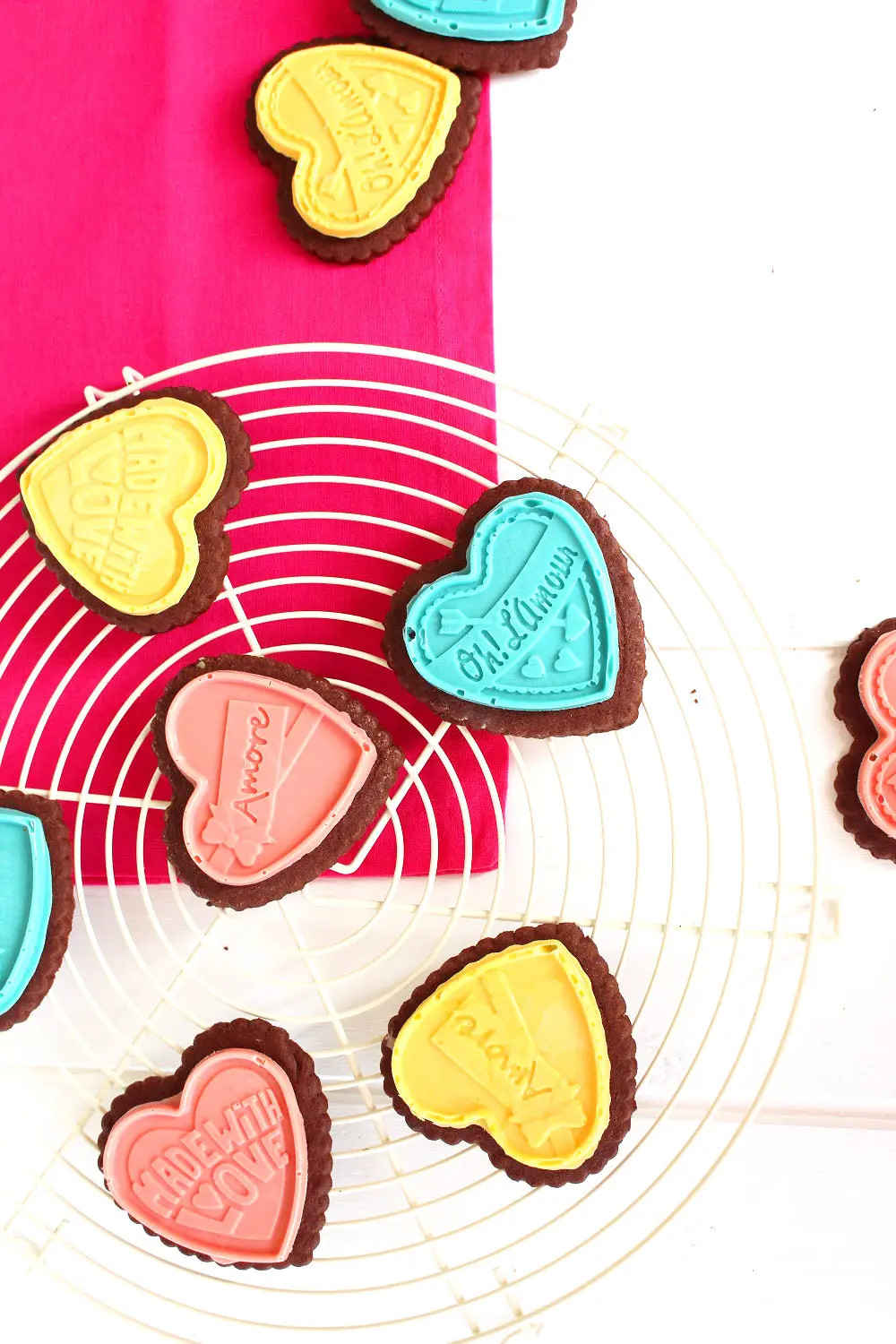 En Este caso he utilizado un kit de SilikoMart para hacer galletas al estilo Le Petit Ecolier, además con alguna frase en francés y en corazones, enseguida me vinieron a la cabeza estas Galletas de chocolate para San Valentín, exactamente como las veis, no lo dudé un segundo.