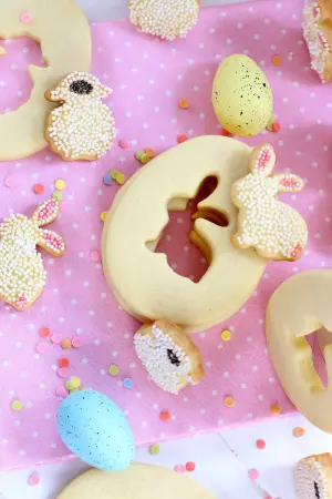 Como sabéis soy amante de las galletas, cada año hago unas diferentes para estas fechas, el año pasado eran galletas de vainilla con forma de conejito de pascua con la colita de algodón de azúcar y el anterior galletas de vainilla y chocolate con la cara del conejito rellena de chocolate negro, y es que me encanta daros ideas para que las podáis hacer y disfrutar, sobretodo con los peques de la casa, que se lo pasan bomba.