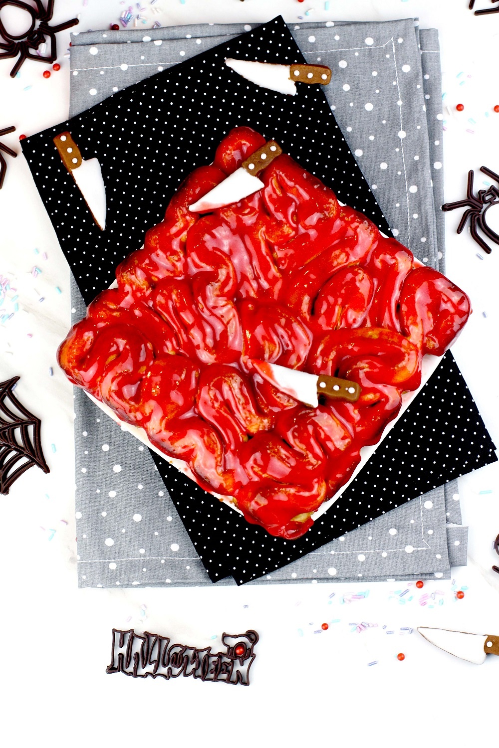 Así que me retó a hacer una receta terrorífica y sangrienta, así que esta es mi propuesta para Halloween, unos rollos de canela sangrientos que parecen un plato de sesos.