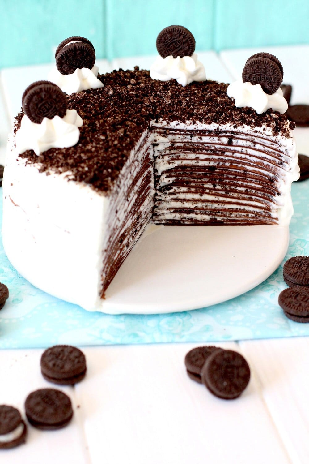 11. ET VOILÀ…ya tenemos esta increíblemente fácil y deliciosa tarta de crepes de oreo.Foto de la receta de tarta de crepes de Oreo