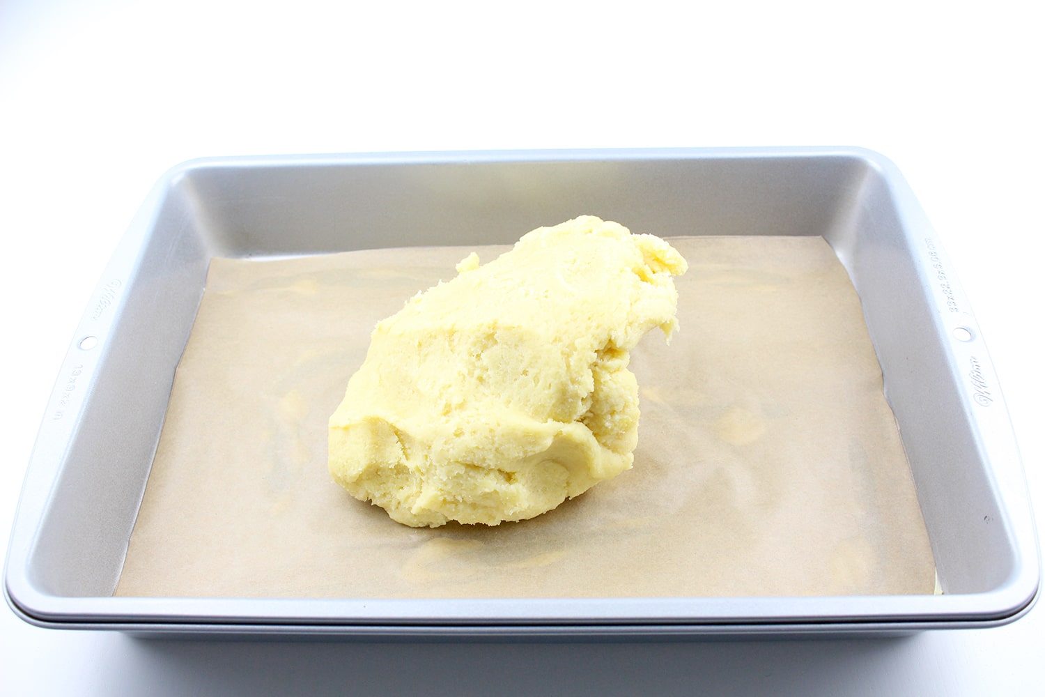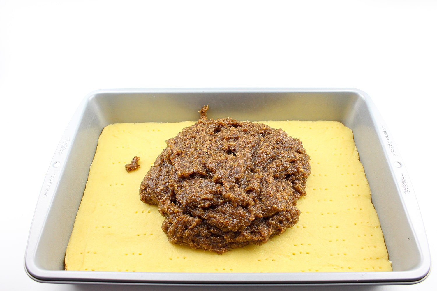 #2 Para que nos sea más fácil alisar la masa, podemos ponerla entre dos hojas de papel film y con un rodillo amasarlo. Después tan solo lo tendremos que poner en la bandeja y terminar de rellenar los huecos.